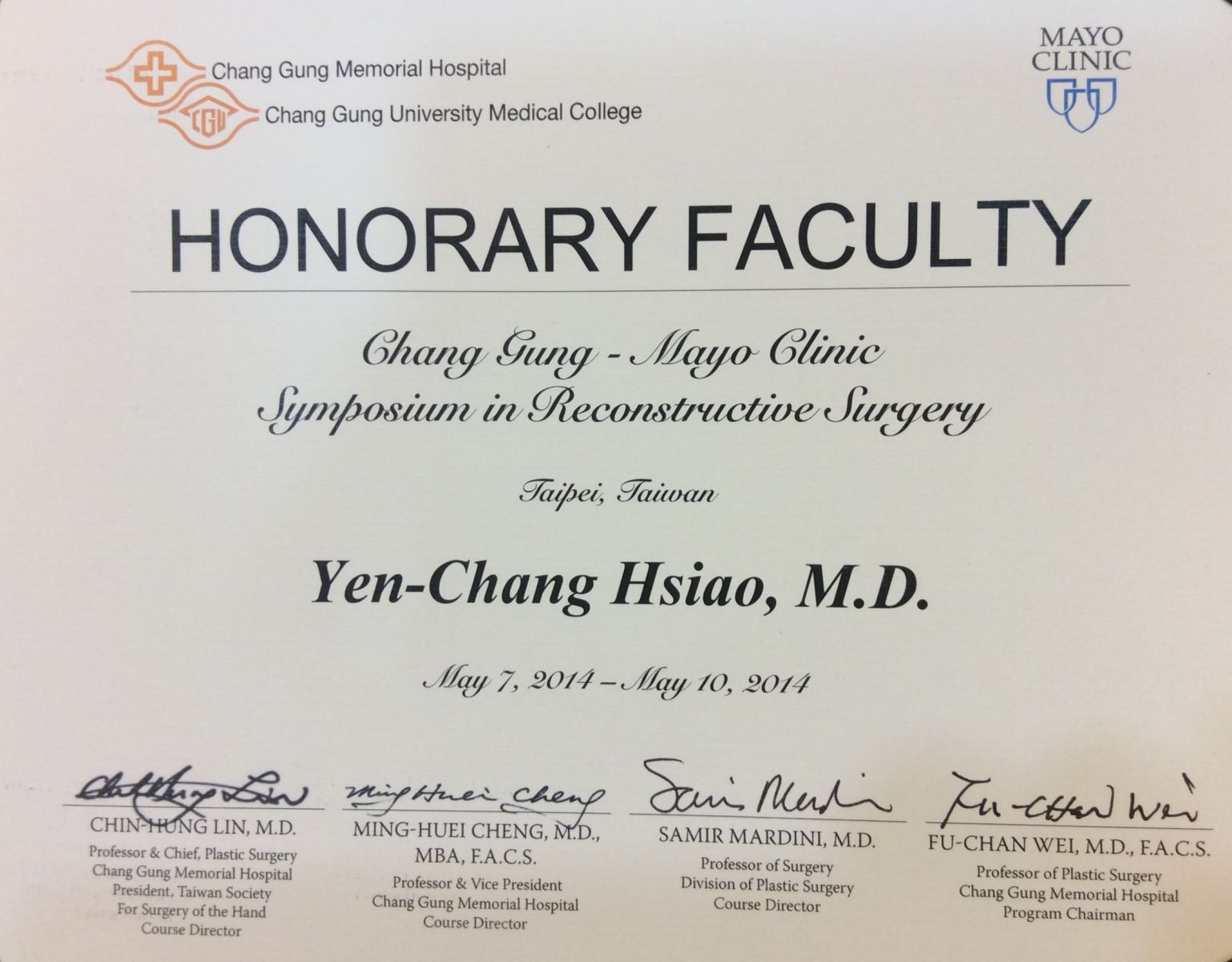 蕭彥彰醫師應邀參加2014長庚梅約醫學中心聯合研討會(2014 Chang Gung Mayo symposium in reconstructive surgery)擔任演講者(Faculty),向會場數百名國內外整形外科醫師演說。梅約(Mayo Clinic)為全美最知名的醫學中心之一和長庚醫院有密切的雙向合作。演講題目為鼻整形手術之美學精煉 (Aesthetic refinement in nasal reconstruction)。會議期間和各國知名鼻整形整形外科醫師進行雙向交流,並且回答各國醫師對於鼻整形的疑問。所提出的美學精煉包括如何利用世界級創新獨特研發的Chimeric autologous costal cartilage graft (內嵌式自體肋軟骨移植)用來預防自體肋軟骨可能發生的彎曲情況(Wapring)獲得極大地迴響。