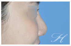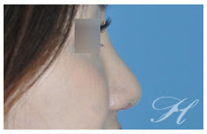 S小姐因為多年前放置的L 型矽膠鼻模的變形導致鼻子的變形。鼻頭沒有高度、鼻樑彎曲。蕭主任將原有的鼻模及疤痕組織移除。利用構造式隆鼻法。利用鼻中隔軟骨將凹陷的鼻頭拉出、再利用自體筋膜(Scalp Fascia)保護變薄的鼻樑,再放入I 型的卡麥拉鼻模重修初他的鼻型。