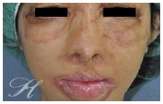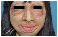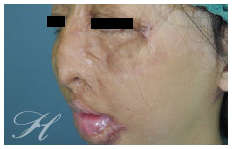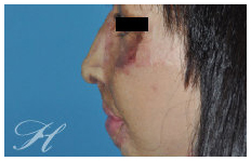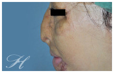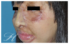 F小姐小時候因為意外被硫酸潑及,造成全臉的深二度至三度的化學性灼傷(Chemical Burn)。十幾年來雖然接受了多次的整形重建手術,但還是留下了極為嚴重的鼻部變形。當我檢視她的鼻子,發現除了鼻部皮膚的嚴重疤痕攣縮外,內部的軟骨鼻部骨架也是遭受到嚴重的破壞。經過了五次的手術,取她的右前臂皮瓣(Forearm Flap)移植到鼻部,並利用她的肋軟骨重新建立起她的鼻部框架,再加上幾次的細部調整手術(Refinement Surgery),最終我們還給了她一個鼻子。