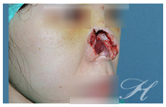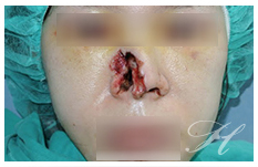W小姐因為騎機車車禍,雖然有戴安全帽但是因為是半罩式的安全帽,所以儘管頭部腦部沒有大問題,但鼻子卻發生了嚴重的受傷及缺損。蕭醫師在W小姐受傷後,立刻進行清創手術(Debridment)將已經死去的組織移除避免感染。因為傷口太大無法直接修復。在病情穩定且傷口沒有感染一周後,進行近全鼻重建手術(Subtotal nasal reconstruction)。蕭醫師分析鼻部的缺損共包含幾個鼻部次單位:右側鼻翼、鼻頭、鼻小柱、右鼻側壁及其各自的內裏(Inner linings)。如需修復上述的復合性缺損(Composite defect),需利用很大的前額皮瓣(Forehead flaps)才能完成。在和W小姐充分溝通後,決定先採用組織撐開器 (Tissue expander),讓前額皮瓣能先被放大已得到足夠的面積供鼻重建使用。經過1.5個月的組織撐開器使用後。在她受傷後約2個月後開始進行多階段式的鼻部重建(Multiple stage nasal reconstruction)手術同時搭配自體軟骨移植來重建鼻子的框架(Cartilage framework)。其後還需要多次的鼻部微調手術(Refinement surgery)。最後,在蕭醫師和W小姐經過半年的共同努力之下,獲得了上述鼻重建的成果。