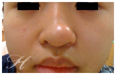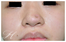J小姐鼻頭皮下腫瘤困擾其多年,每次想到因為切除腫瘤後鼻頭要留下一條疤痕就裹足不前。我利用鼻外手術法(Open Rhinoplasty)的原理,將原本需切在鼻頭上明顯的疤痕轉移到不容易觀察到的鼻小柱(Columella),不僅完整地移除了鼻頭的腫瘤,也因為利用鼻外手術法可以修補因為腫瘤壓迫而變形的下鼻翼軟骨(Lower Lateral Cartilage)同時兼顧重建和美學的概念,完整地還原了她的鼻子。