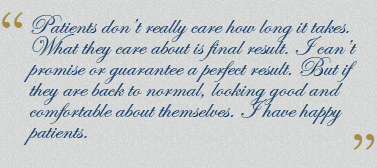 鼻部重建手術充滿了挑戰性,而且每個重建的方式都有很大的不同。大多數都需要許多次手術及病患的充分耐心和配合才能慢慢達到越來越完美的最終目標。 我的經驗是,病患最在乎的是手術的結果,不會在乎要花多久時間或是要花多少次手術來完成。最重要的是讓病人知道還有希望。我不能保證或擔保有個完美的結果,但是如果能讓病患能恢復像以往正常且好看的外表,我就有一位開心的病人。而身為還原者的我,也就變成一位因病患滿意的微笑而開心的醫師了!