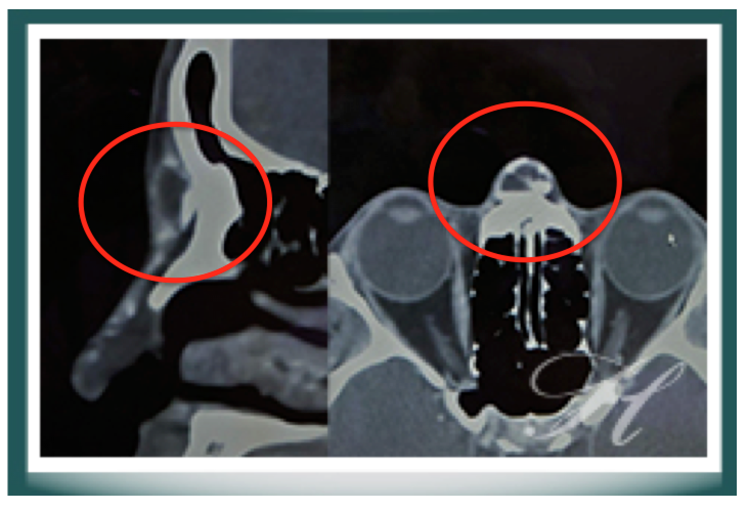 (圖六)利用微晶瓷注射山根後造成局部肉芽組織增生及皮下異物組織反應。利用斷層掃描發現皮下有微晶瓷所產生的鈣化現象(Calcification)和異物反應後的組織液增生(Seroma)。