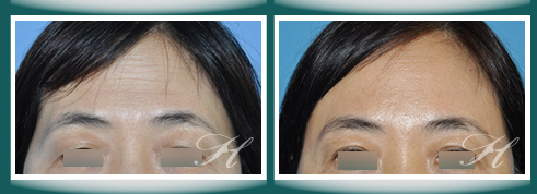 - - 手術效果因人而異,上圖為該案例實際術後成效 - -前額內視鏡五爪鉤拉皮及自體脂肪夫妻宮 (Endoscopic forehead lifting, fat graft to temporal )