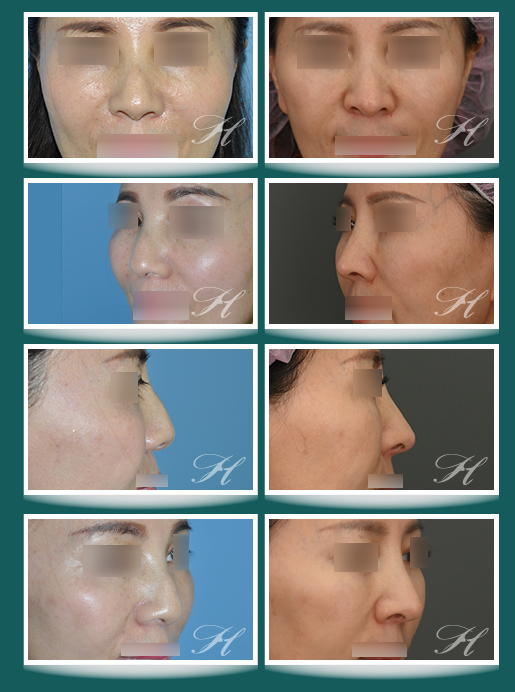 U女士,先前利用矽膠隆鼻因而導致莢膜攣縮,導致奇怪的鼻型、鼻頭下垂、鼻樑線條不夠好。因此U女士到麗舍整形外科找到蕭彥彰教授幫忙,蕭教授利用開放式鼻整形:移除舊的鼻模及疤痕組織,敲鼻骨,再利用自體肋骨進行鼻頭調整、延長鼻頭、改善鼻樑-鼻頭-鼻珠線條,併採用ePTFE (Gortex)進行鼻樑增高。達到完整的二次鼻整形的結果。