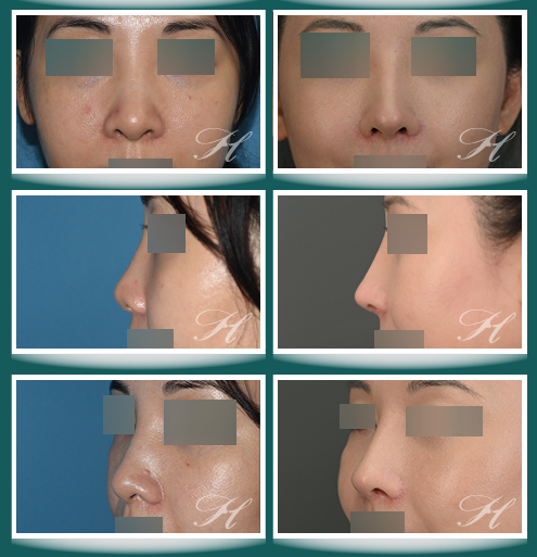 - - 手術效果因人而異,上圖為該案例實際術後成效 - -M小姐,因為鼻頭低矮、鼻樑寬大不夠立體、鼻翼過寬、法令紋凹陷。因此他到麗舍整形外科找到蕭彥彰教授幫忙,蕭教授移再利用自體肋骨軟骨進行鼻頭調整,併採用ePTFE (Gortex)進行鼻樑增高、同時利用切碎肋骨(Diced cartilage)進行法令紋填補(貴族手術 ;paranasal augmentation)、縮鼻翼 。達到成功的鼻整形結果,同時改善凹陷的中臉及法令紋。